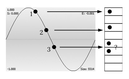 Thinking of this reminded me of the problem of dithering a sound wave into a low-bit resolution. I've written another piece here about audio dithering and quantum mechanics but I'll recapitulate. When digitising a smooth wave, we can assign a value to the nearest number that the wave amplitude corresponds with, sort of like fitting the wave into a series of boxes and choosing the nearest box to the current amplitude. See here: