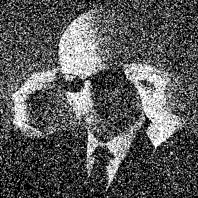 The latter is a binary image of the former, it uses only black and white dots, yet from a distance, the level of grey can be inferred due to random scattering. It is in this way, I postulate, that the curvature of space is stored. Objects which move though this space move, on a per-particle basis, fully through space or fully through time, but on average, it appears that the whole object is gliding through space-time in the correct proportions.
